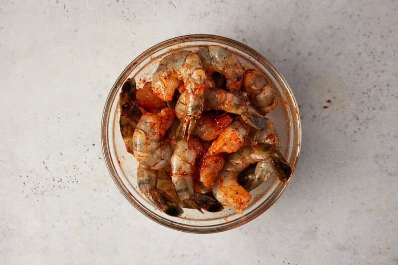 - Place shrimp in a large bowl and add olive oil, smoked paprika, salt and pepper. Stir to coat and set aside.1 pound Shrimp (peeled and deveined with tails on), 2 teaspoons smoked paprika, ½ teaspoon kosher salt, ½ teaspoon coarse ground black pepper, 1 tablespoon olive oil