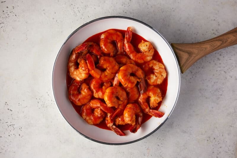 Finish the dish: . Add sauce to the pan filled with cooked shrimp and stir to coat.