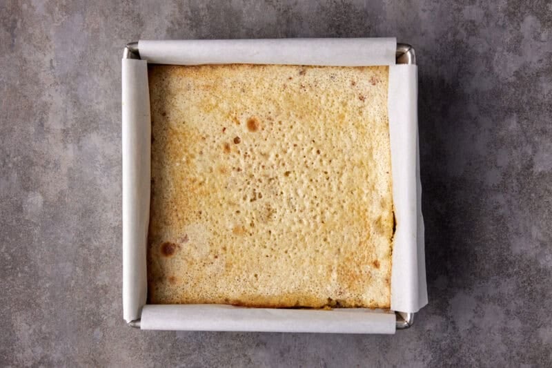 Bake until center is just set and bounces back. Tent with foil if it browns too fast. Cool completely and dust with powdered sugar before serving.