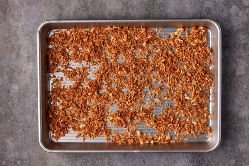 - Spread coconut on a sheet pan and bake until golden brown, shaking the pan every few minutes as needed. This should take about 10 minutes. Allow coconut to cool.⅓ cup sweetened flaked coconut