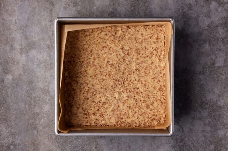 Blitze crust ingredients in a food processor until sandy. Press into a lined 8×8 pan and bake.