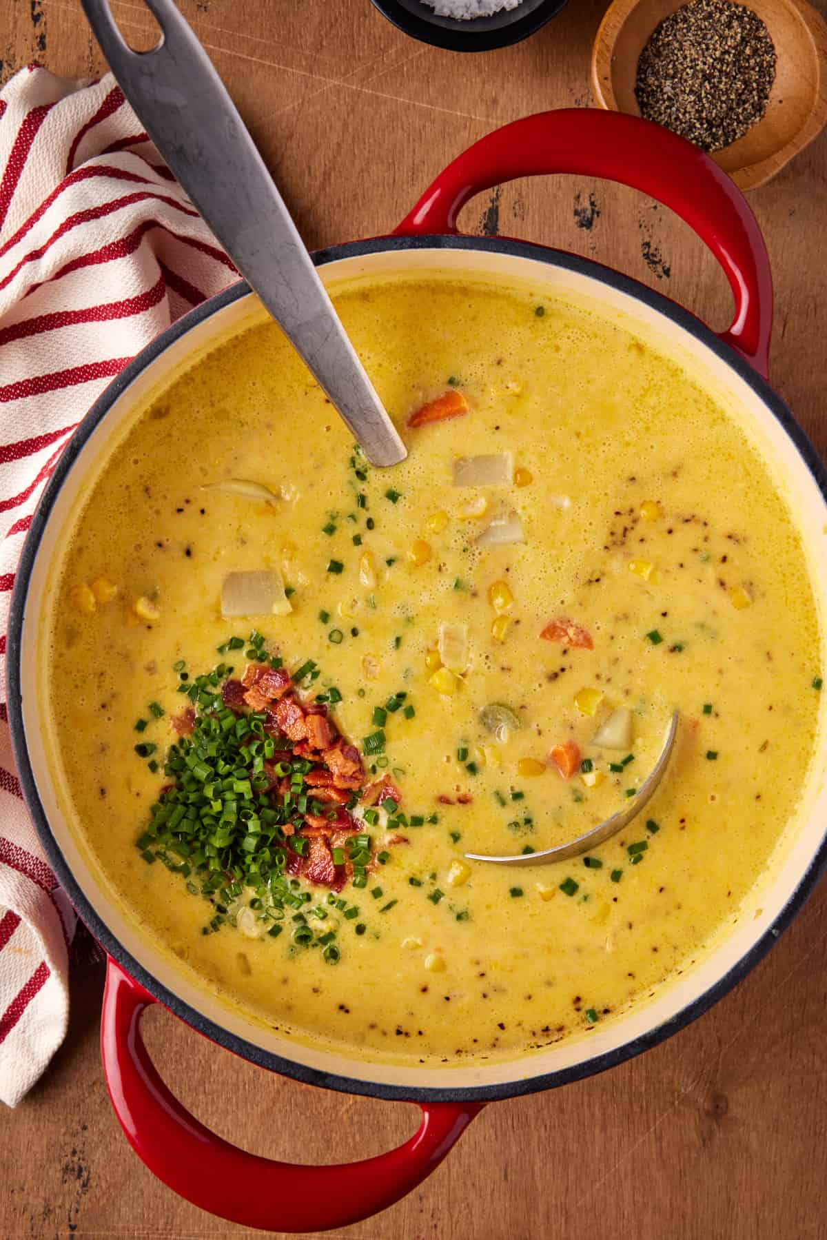 - Stir in ⅔ of bacon and fresh chives. Season soup to taste with salt and pepper. Ladle into bowls and garnish with remaining bacon and more fresh chives, if desired.2 tablespoons chopped fresh chives, salt and pepper