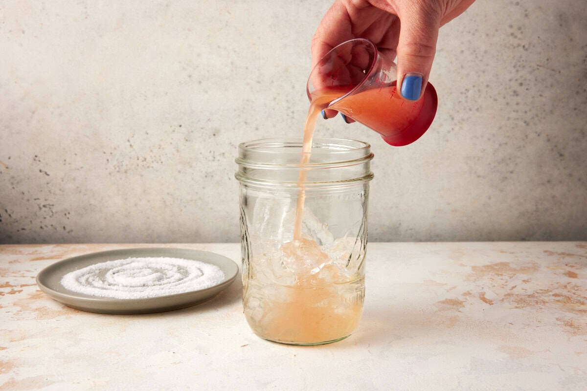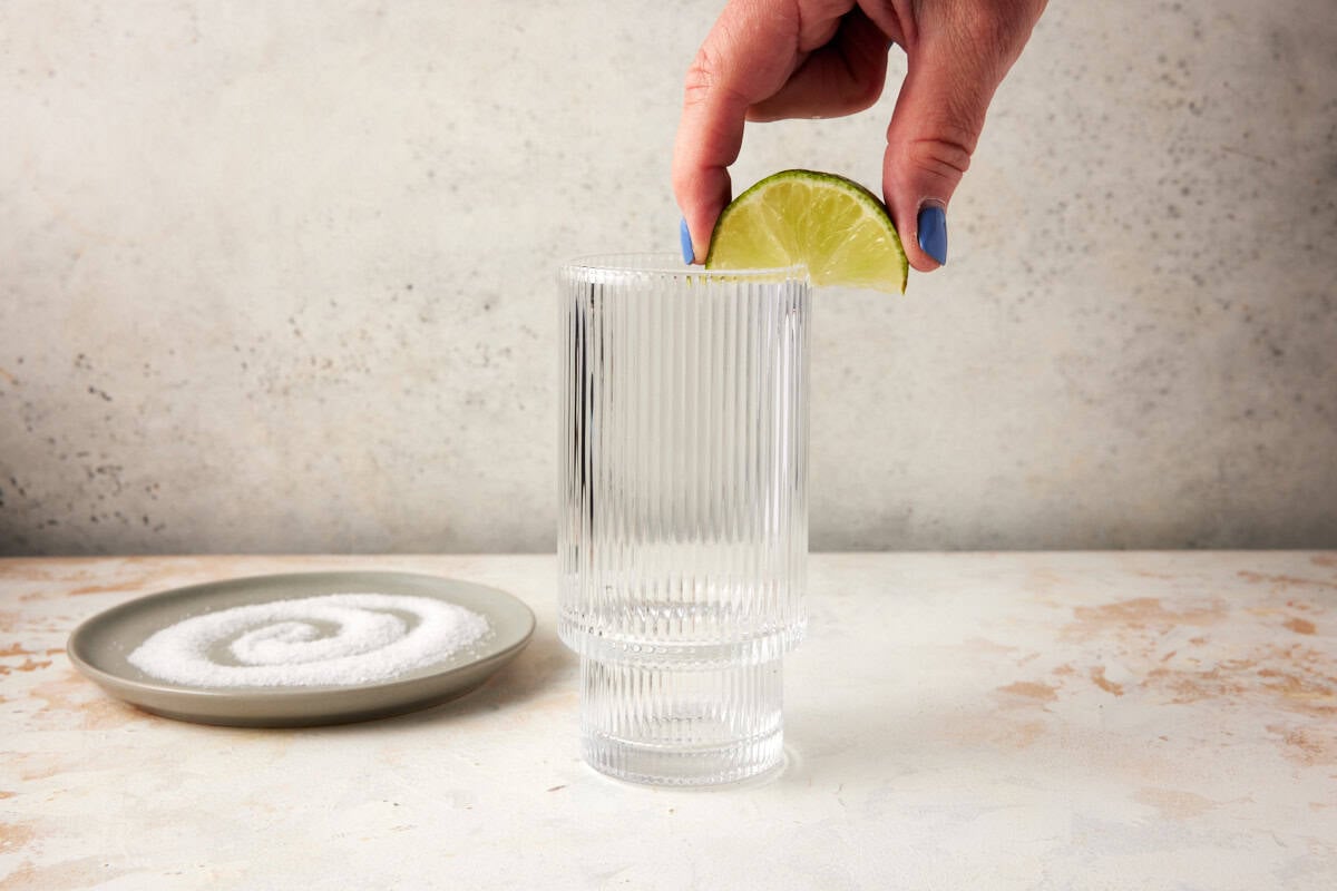 - Prepare glass: Rim your glass with a lime wedge, then roll the edge in coarse salt. Fill with ice.