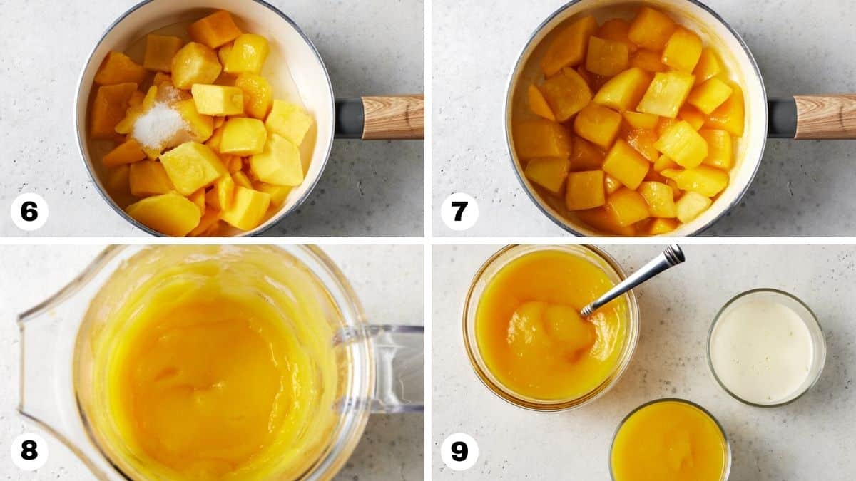 Simmer mango, sugar, and water until soft. Blend it with lime juice until silky smooth. Let it cool.