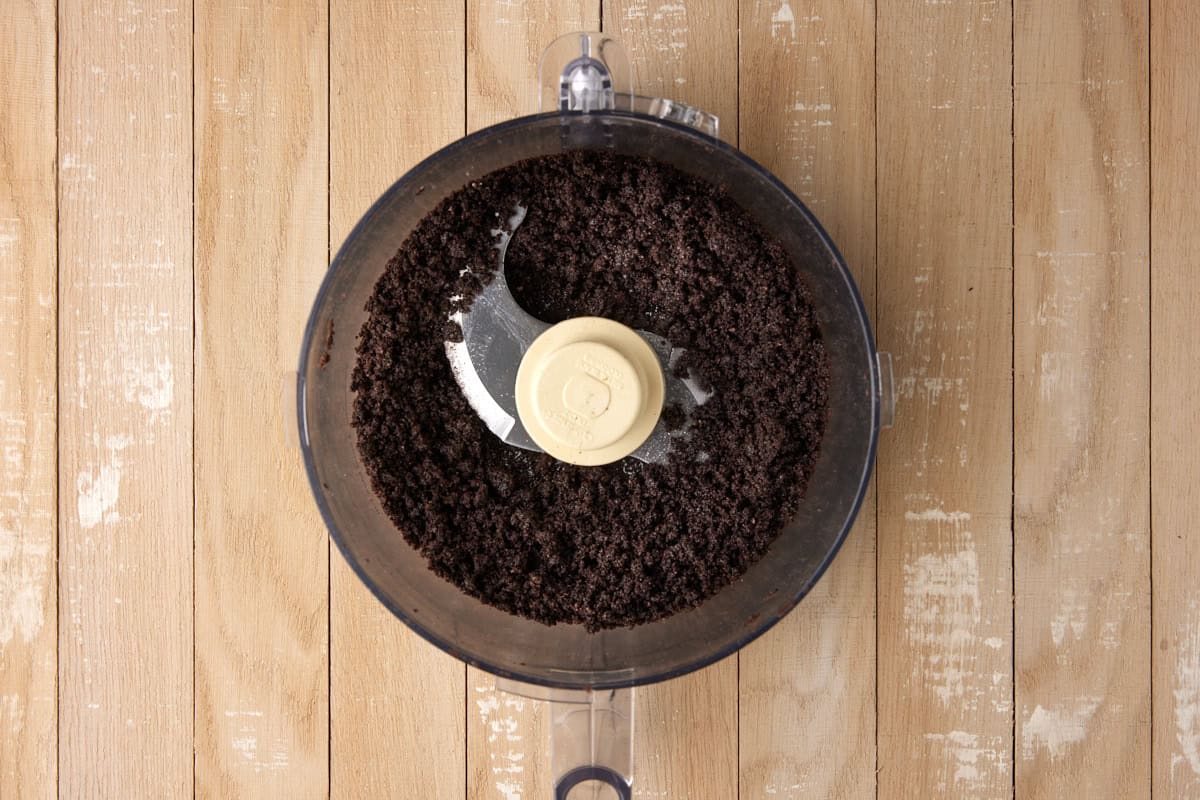 - Place 18 chocolate sandwich cookies into a food processor and pulse until they are fine crumbs.18 chocolate sandwich cookies