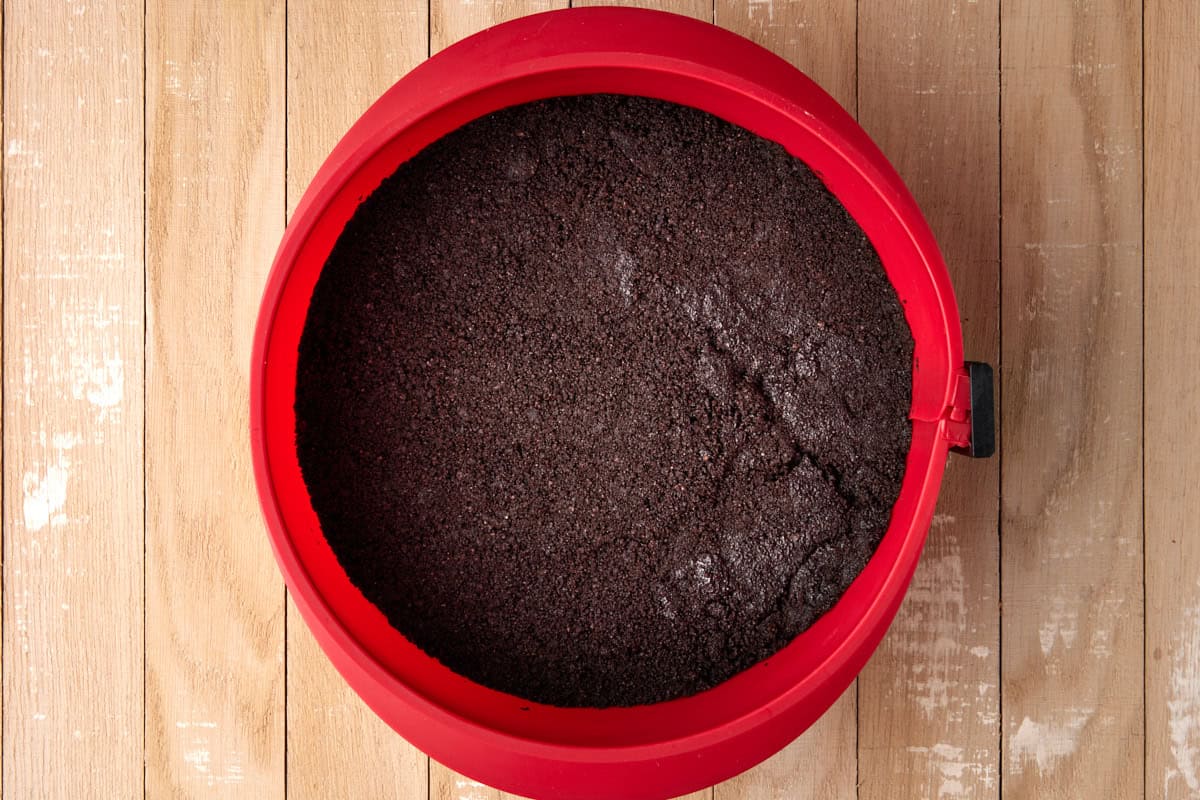 - Place chocolate crumb mixture in the bottom of a springform pan and press mixture down firmly. Freeze while you are making the filling.